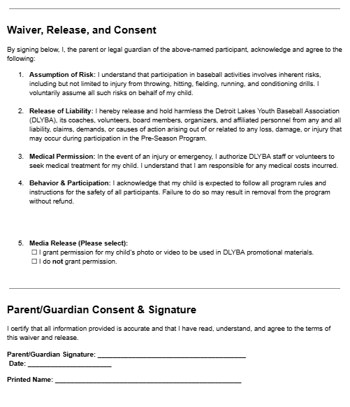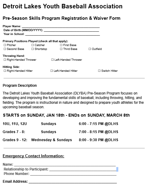 Must be a Detroit Lakes Youth Baseball Player or Detroit Lakes Public Schools student to participate.